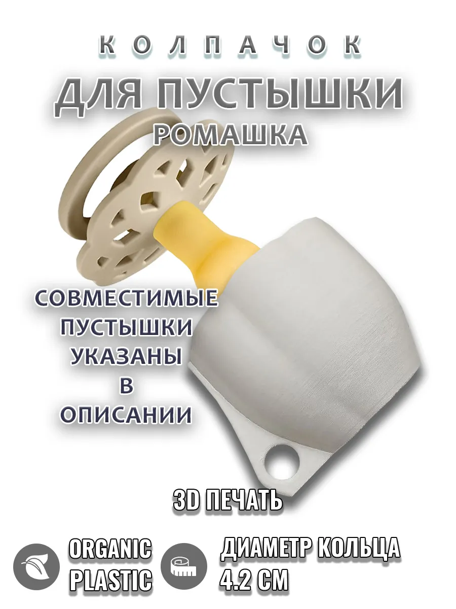 Подходит к соскам пустышкам разных брендов с кольцом ромашка диаметром 4.2см.