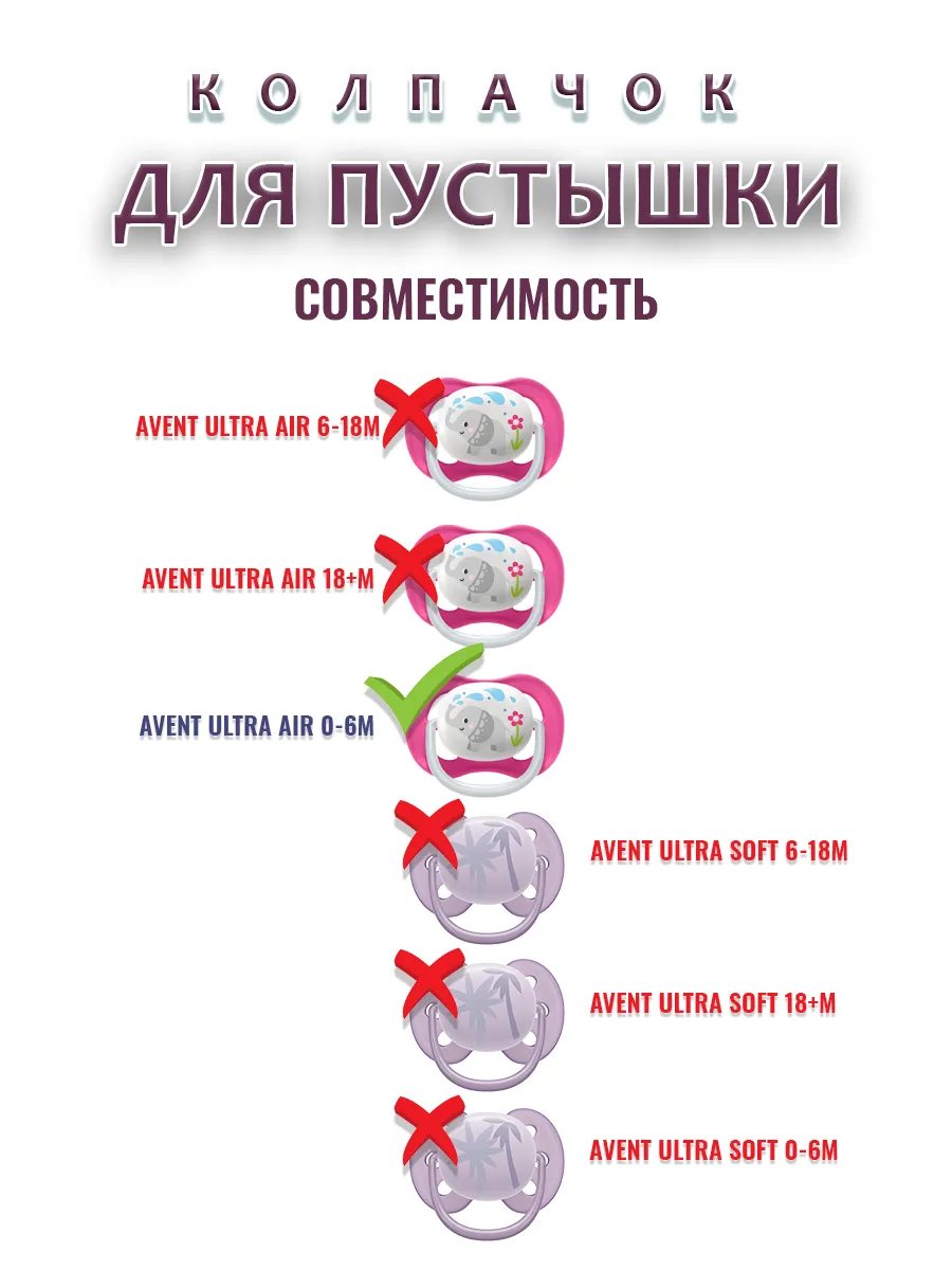 Колпачок подходит к соске пустышке брендa AVENT ultra air 0-6m. НЕ СОВМЕСТИМ С МОДЕЛЯМИ - AVENT ultra air 6-18m, AVENT ultra air 18+m и всеми AVENT ultra soft.