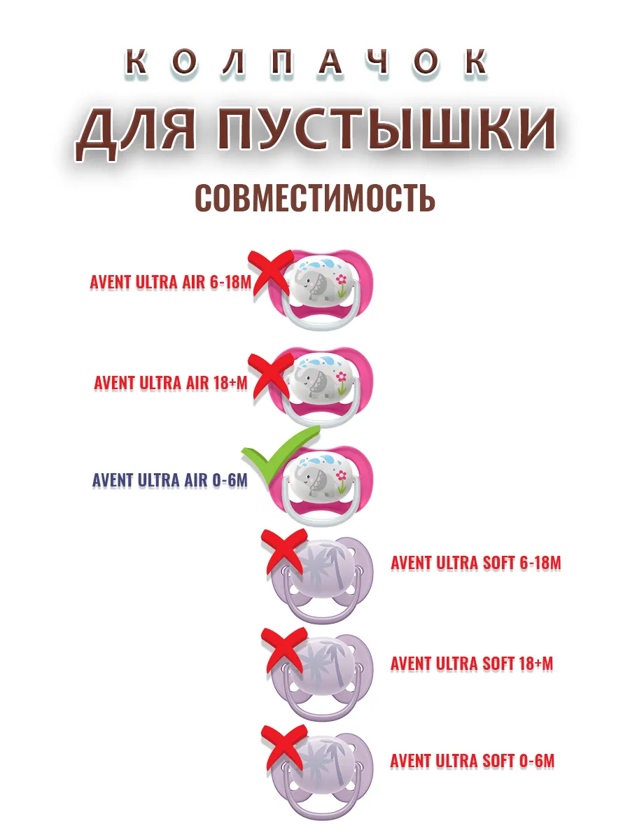 Колпачок подходит к соске пустышке брендa AVENT ultra air 0-6m. НЕ СОВМЕСТИМ С МОДЕЛЯМИ - AVENT ultra air 6-18m, AVENT ultra air 18+m и всеми AVENT ultra soft.