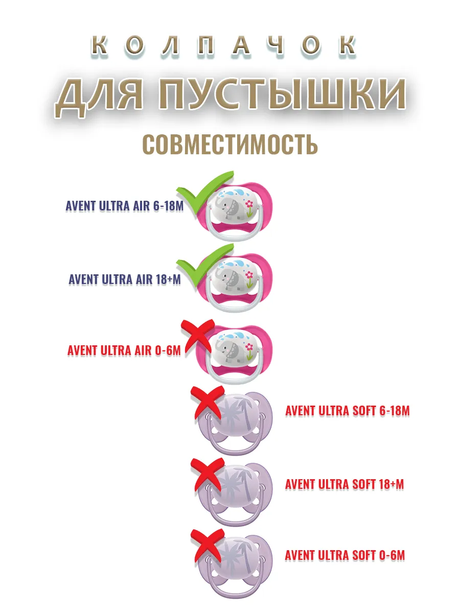 Колпачок подходит к соскам пустышкам брендa AVENT ultra air 6-18m, 18+m. НЕ СОВМЕСТИМ С МОДЕЛЯМИ - AVENT ultra air 0-6m и всеми AVENT ultra soft.