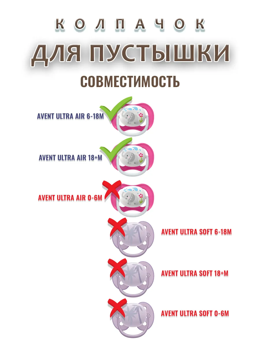 Колпачок подходит к соскам пустышкам брендa AVENT ultra air 6-18m, 18+m. НЕ СОВМЕСТИМ С МОДЕЛЯМИ - AVENT ultra air 0-6m и всеми AVENT ultra soft.