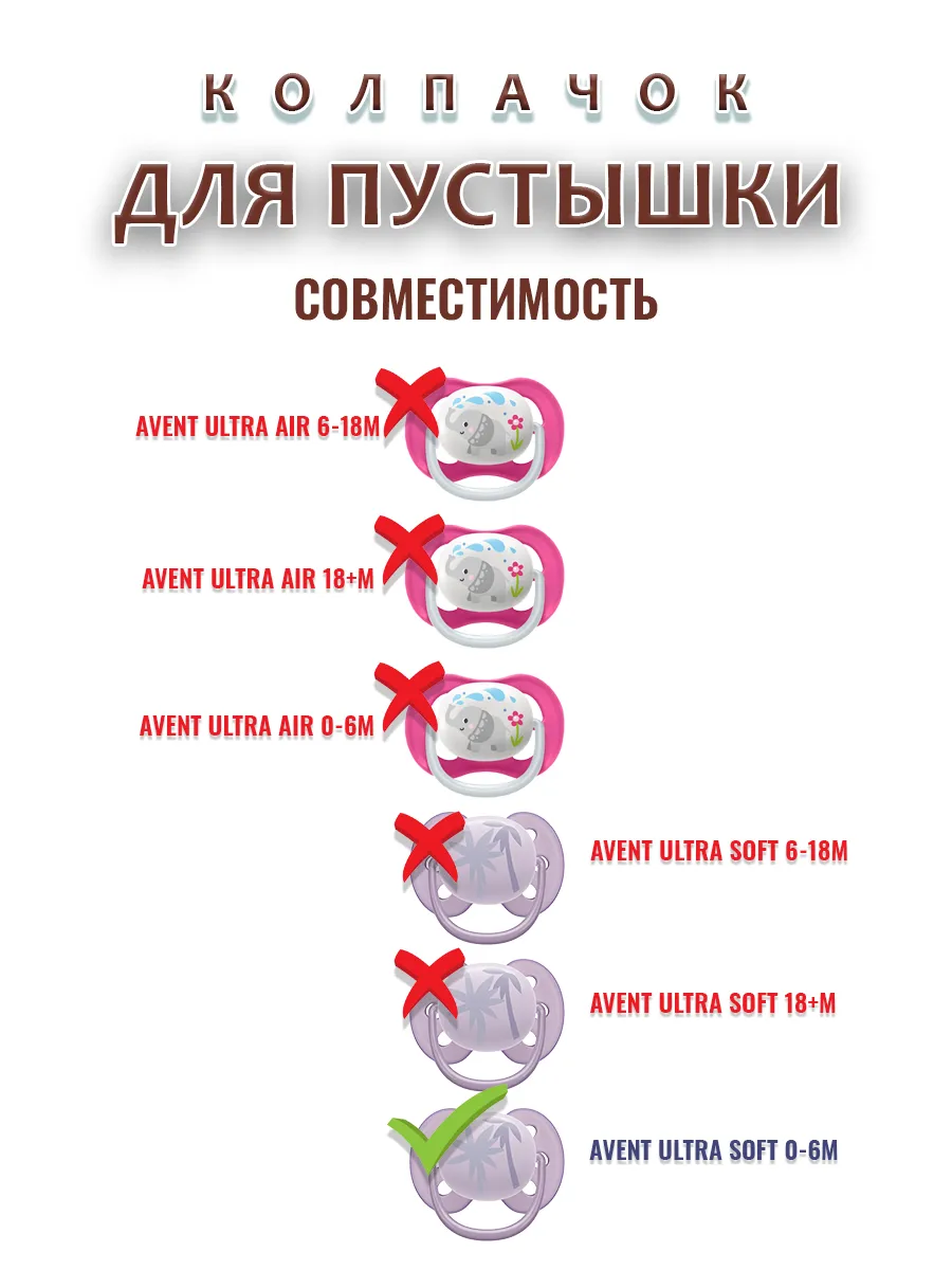 Колпачок подходит к соскам пустышкам брендa AVENT ultra soft 0-6m. НЕ СОВМЕСТИМ С МОДЕЛЯМИ - AVENT ultra soft 6-18m, AVENT ultra soft 18+m и всеми AVENT ultra air.