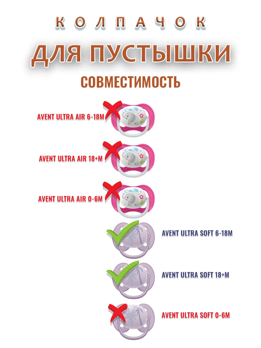 Колпачок подходит к соскам пустышкам брендa AVENT ultra soft 6-18m, 18+m. НЕ СОВМЕСТИМ С МОДЕЛЯМИ - AVENT ultra soft 0-6m и всеми AVENT ultra air.