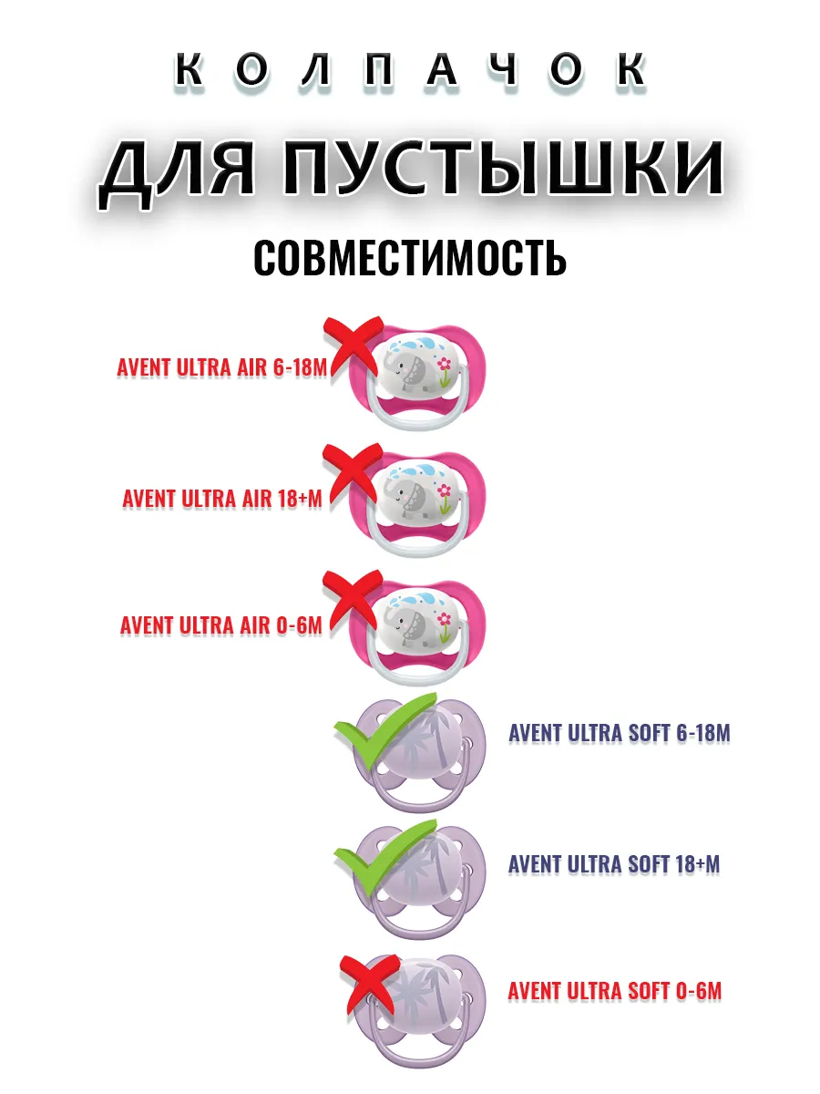 Колпачок подходит к соскам пустышкам брендa AVENT ultra soft 6-18m, 18+m. НЕ СОВМЕСТИМ С МОДЕЛЯМИ - AVENT ultra soft 0-6m и всеми AVENT ultra air.