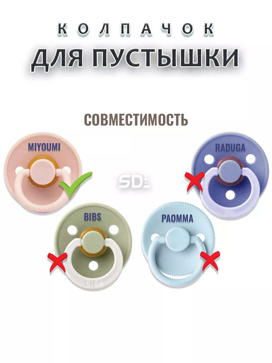 Колпачок подходит к соскам пустышкам бренда MIYOUMI c кольцом диаметром 4.6см. НЕ СОВМЕСТИМ С БРЕНДАМИ - Paomma, BIBS и Raduga.