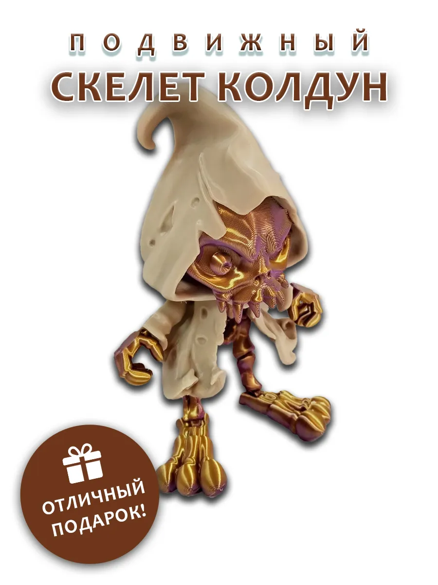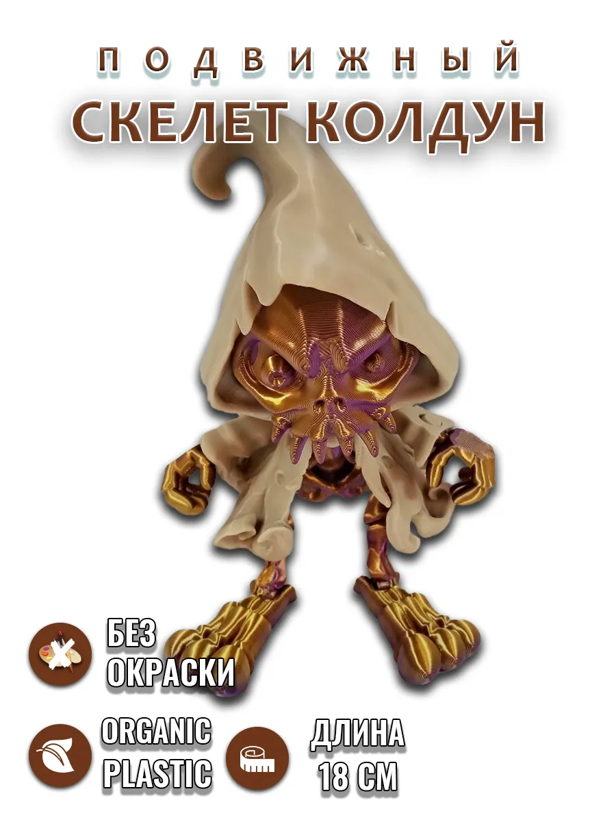 Погрузитесь в мир магии и тайн с этой уникальной подвижной фигуркой золотисто-фиолетового скелета колдуна! Каждая деталь этой игрушки, созданной с помощью технологии 3D-печати, проработана с вниманием к мелочам. Эффектно развевающаяся бежевая мантия придаёт фигурке динамичность и живость, создавая ощущение, будто колдун готов к новым приключениям.
