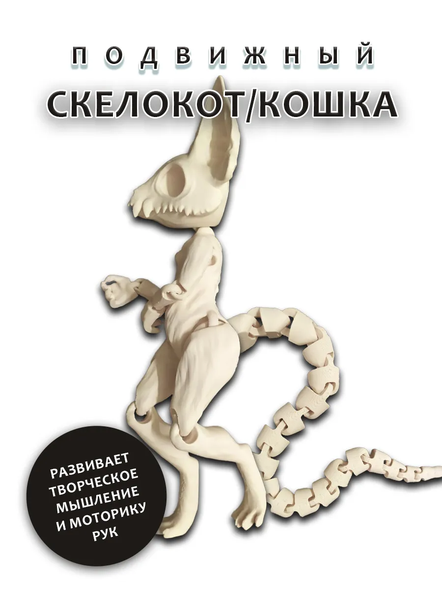 Представляем вам подвижную игрушку загадочного скелета кота цвета слоновой кости. Этот очаровательный персонаж с торчащими ушками и когтистыми лапками станет настоящим украшением вашей коллекции. Благодаря продуманной конструкции, кот может принимать различные позы, что добавляет ему игривости и динамики.