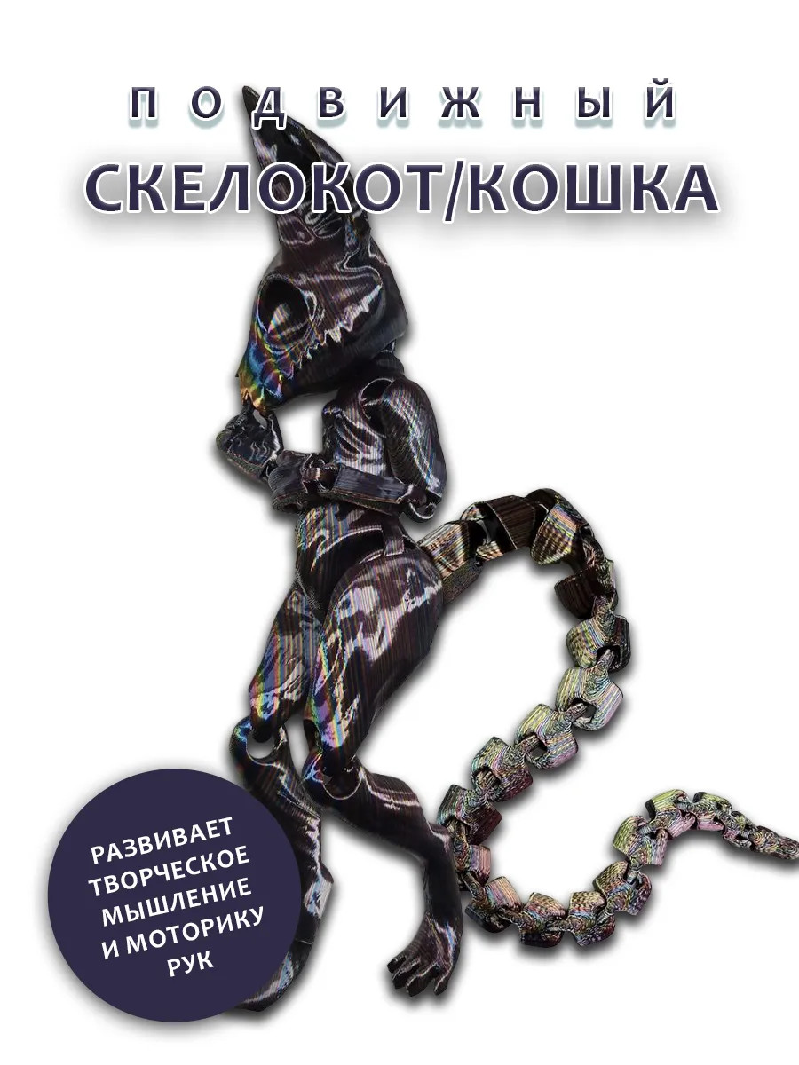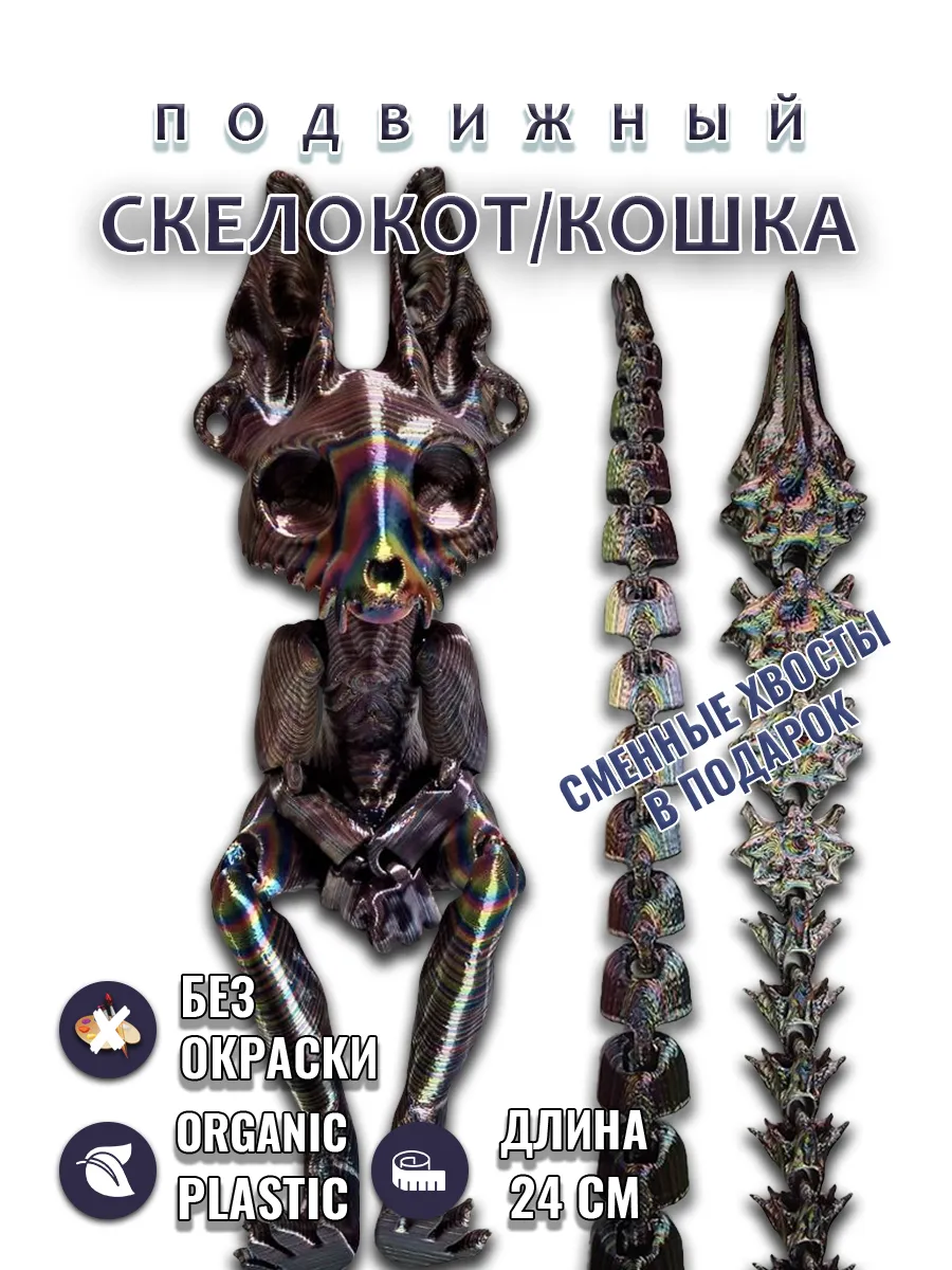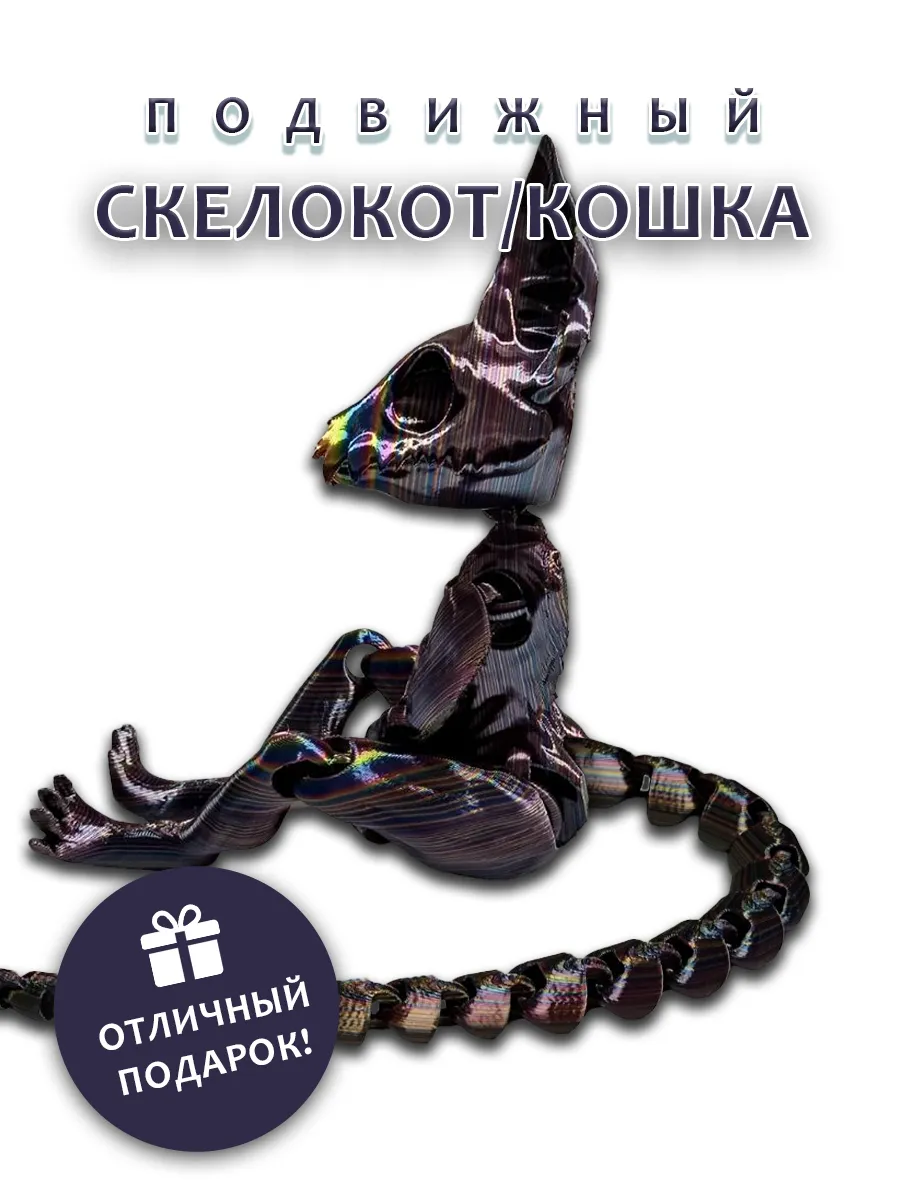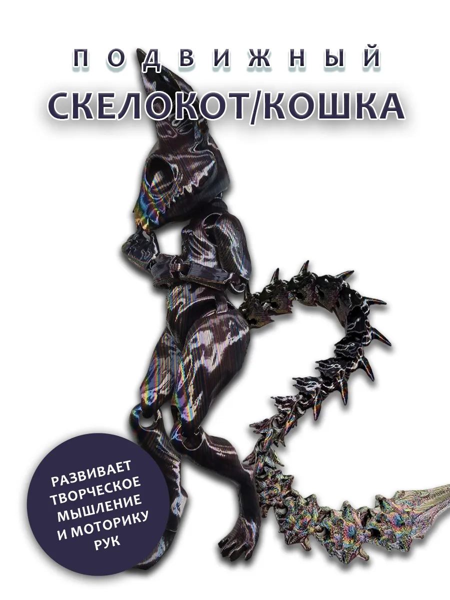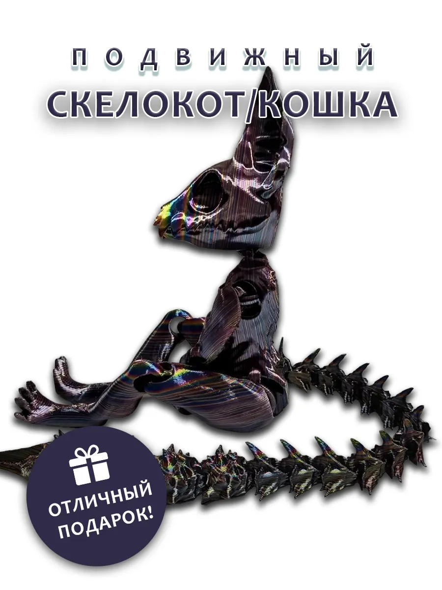 Уникальные сменные хвосты позволяют легко менять его облик в зависимости от настроения или игры, вдохновляя на создание увлекательных историй. Каждая деталь игрушки, напечатанной на 3D-принтере, тщательно проработана, что придает ей выразительность и характер. Эта игрушка станет отличным подарком, добавляя немного магии и веселья в каждый день. Создайте свои собственные приключения с этим очаровательным скелетом кота!