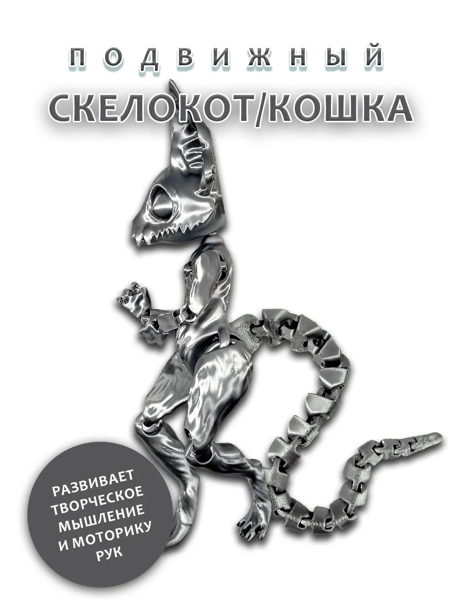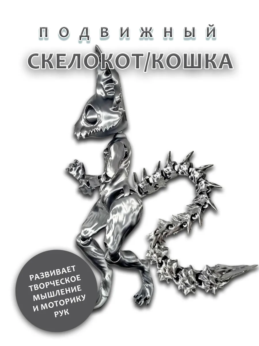 Представляем подвижную игрушку в виде фантазийного скелета кота серебряного цвета. Эта игрушка выделяется своими выразительными чертами: торчащие ушки, острые зубки и цепкие лапки придают ей уникальный характер. Оригинальные сменные хвосты позволяют менять образы, добавляя элемент творчества в игру.