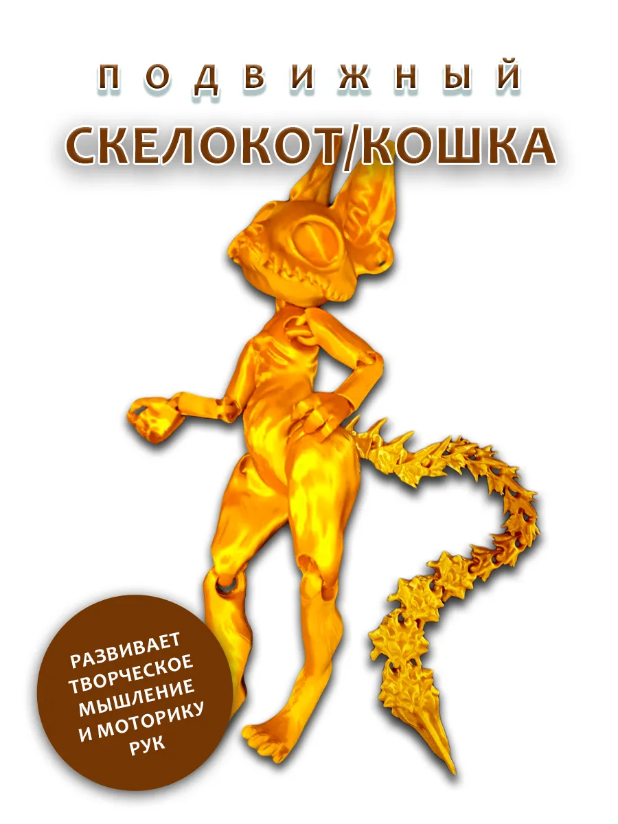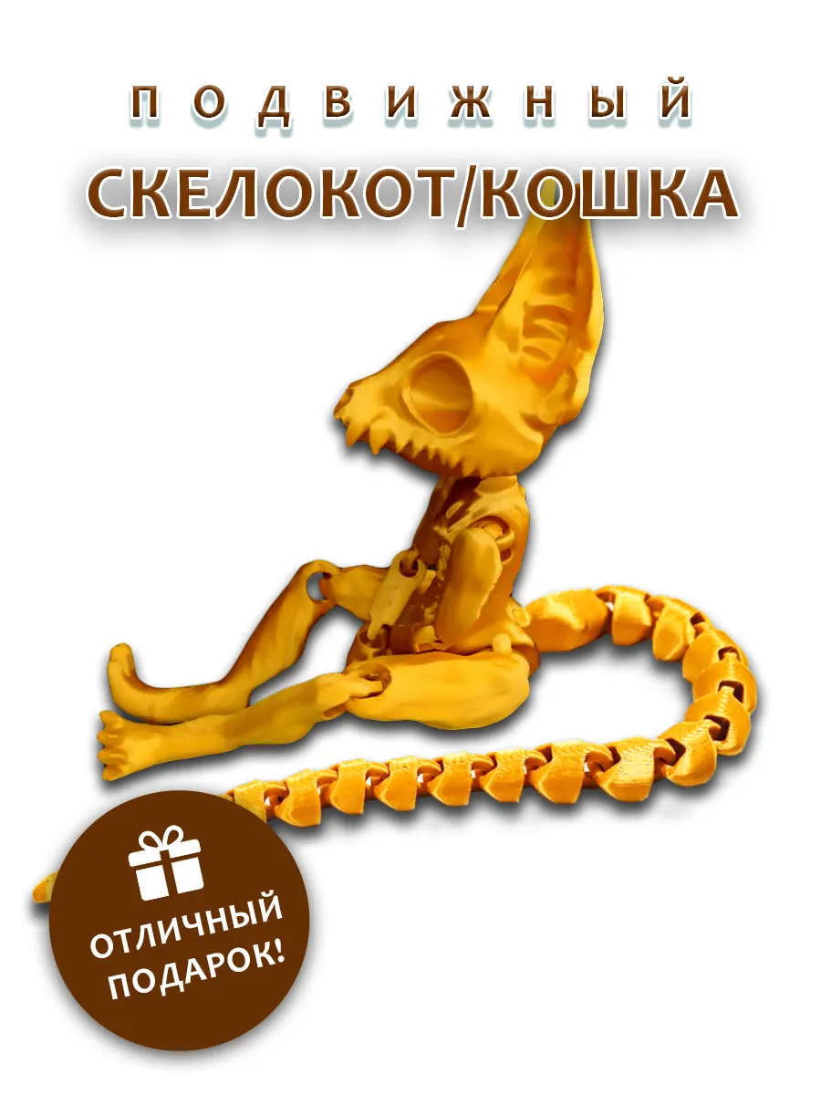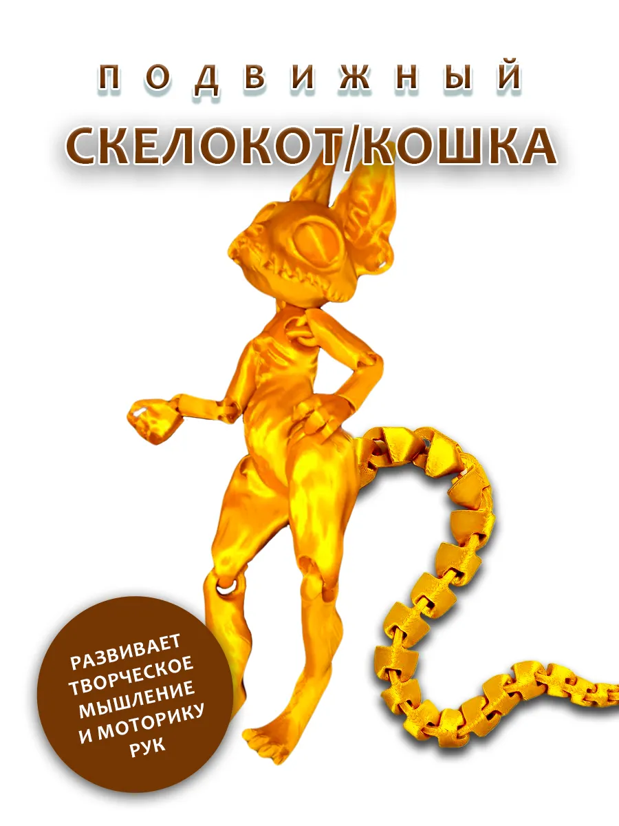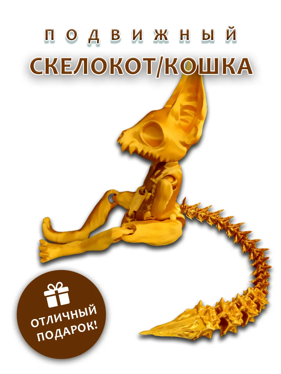 Представляем подвижную игрушку таинственного скелета кота золотого цвета, которая станет ярким акцентом в любой коллекции. С характерными торчащими ушками и острыми зубками, этот кот привлекает внимание своим уникальным дизайном. Его цепкие подвижные лапки позволяют легко менять позы, добавляя игривости и динамичности.