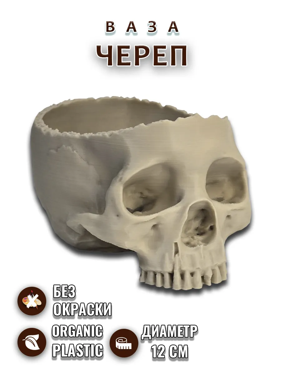 Эта уникальная вазочка в форме реалистичного черепа цвета слоновой кости станет эффектным акцентом в вашем интерьере. Искусно проработанные детали, такие как выразительные глазницы и ряд верхних зубов, придают изделию неповторимый характер и оригинальность. Благодаря технологии 3D-печати, каждая линия и текстура идеально передают атмосферу таинственности.